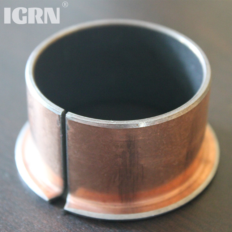 这是一种带有法兰结构的无油轴承产品,设计用于防止轴向受力时脱落。