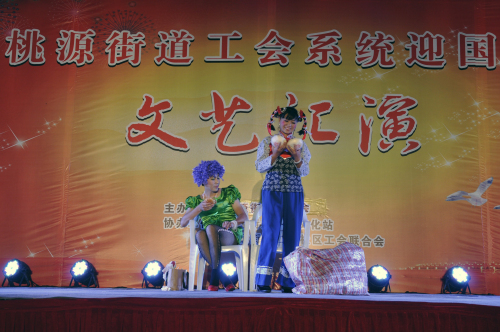 9月26日晚上,县桃源街道工会系统举办庆国庆文艺演出。本次演出邀请了桃源街道工会主席、企业代表、团员青年等人观看。演出节目有独唱、舞蹈、曲艺小品、乐器独奏等。如意工会选送舞蹈《俏花旦》、哑剧《傻妞进城》,优美的舞姿,生动的表演迎得了台下阵阵掌声。整场汇演,内容丰富、精彩纷呈,喜庆热烈,高潮迭起,表达了祝福祖国母亲65周岁的美好心声。