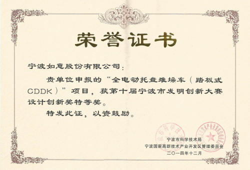 此外,公司的“全电动托盘搬运车(CDDK踏板式)”项目获得2014年度发明创新大赛设计创新奖特等奖,全市唯一一家。