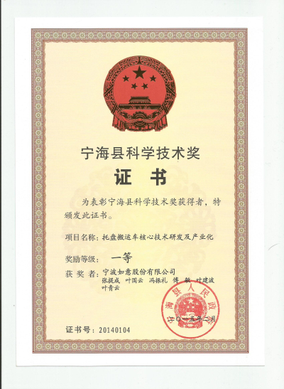 近日,宁海县科技局组织专家按照《宁海县科学技术奖励办法》的规定对全县工业企业申报的科技奖项目进行了评审,最终如意公司的“托盘搬运车核心技术研发及产业化项目”被评为2014年度宁海县科技进步奖一等奖,全县共有5家单位获此荣誉。