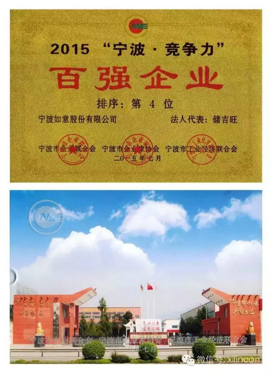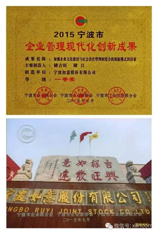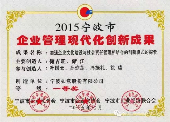 日前,宁波市企业联合会、宁波市企业家协会2015宁波市企业家活动日暨百强颁奖典礼在宁波隆重举行。如意公司总经理储江等27位宁波企业家被评为第14届宁波市优秀企业家。由董事长储吉旺、总经理储江作为主要创造人完成的“加强企业文化建设与社会责任管理相结合的创新模式的探索”的项目荣获2015年宁波市企业管理现代化创新成果一等奖。宁波如意公司被评为2015宁波市制造业百强企业和2015宁波•竞争力百强企业。