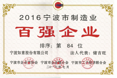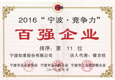 7月28日,2016宁波市企业家活动日暨百强企业颁奖典礼由宁波市企业联合会、企业家协会、工业经济联合会在宁波举行。如意公司获评宁波•竞争力百强企业,排名第11位;宁波市制造业百强企业,排名第84位。
