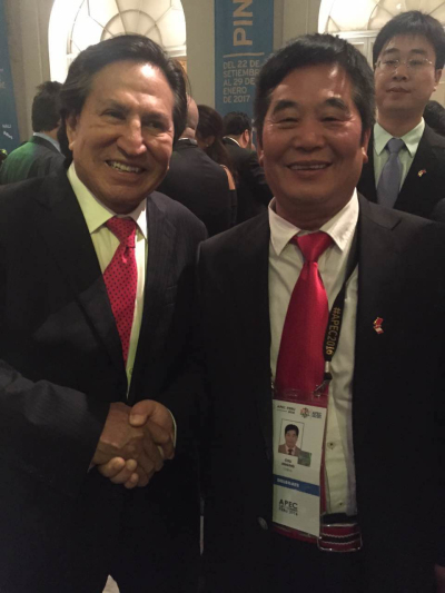 在APEC会议上,储董与秘鲁前总统亲密握手