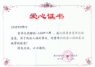 近日,如意公司向浙江省残疾人福利基金会又捐赠10万元,用于残疾人福利事业。据统计,今年储吉旺董事长和公司累计向慈善公益事业捐款500多万元,至今累计捐款近1.3个亿元。