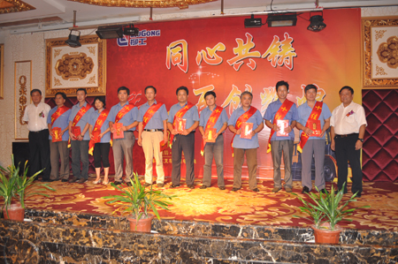 随后,广西柳工王董事长和黄敏副总裁共同为“十佳员工”颁发了奖项,接着颁发了十年庆典文体活动团体项目奖,包括篮球、拔河、象棋、升级等比赛项目的奖项。