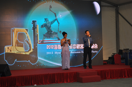 2012海斯特叉车中秋客户答谢会在锣鼓声中拉开帷幕,主持人乘坐海斯特欧洲生产的人上行三向叉车C1.5S驶向台上。随后,上海海斯特叉车制造有限公司总经理梁锦鸿先生出席会议并致欢迎辞,首先对各位嘉宾的到来表示了诚挚的欢迎,同时对各单位对海斯特长久以来的支持与厚爱表示了衷心的感谢。随后,梁总回顾了海斯特的历史同时展望了海斯特未来动向。答谢会分为产品介绍、新品演示、情景剧《海斯国传奇》表演和晚宴.