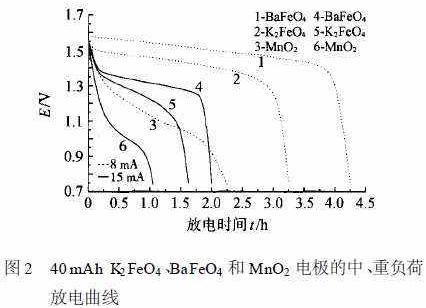 高铁酸盐物质在电池反应中可以得到3 个电子, 所以有相对较高的容量。从表1 可以看出, 高铁酸锂的理论容量高达601Ah/kg。高铁酸钡的理论容量也有313 Ah/kg。而MnO2 的容量为308Ah/kg。