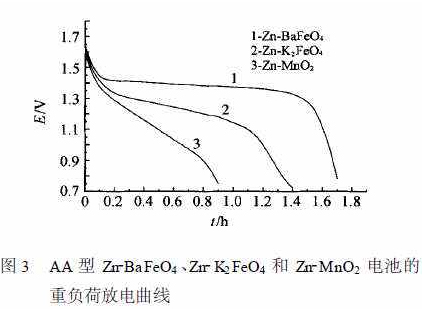 高铁电池放电曲线平坦。 如Zn-K2FeO4 , 70%以上的放电时间在1.2-1.5V。
