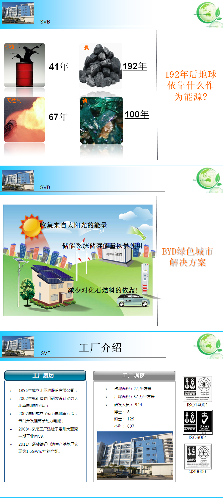 1995年成立比亚迪股份有限公司; 2002年就组建专门研发设计动力大功率电池的团队; 2007年初成立了动力电池事业部,专门开发锂离子动力电池; 2008年SVB工厂选址于惠州大亚湾一期工业园C9。 2011年磷酸铁锂电池生产基地已实现约1.6GWh/年的产能。