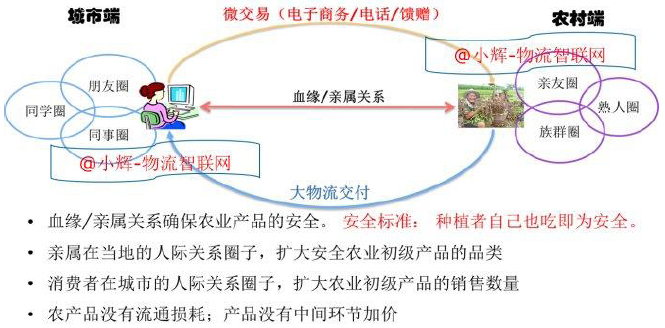 在这种模式下,产品的营销实际上就是人际关系和诚信的营销。人际关系、个人诚信以及产品质量越好,获得的销售机会也就越多。而一旦失去了诚信,销售机会就不复存在。而物流承担的是一个全透明的交付过程:发货方将产品包装好,贴上封签,物流则按照要求将包裹送到收货方的家中,收货方检查封签完好即可签收。在这种模式下,责任清晰、分工明确。产品安全和质量由发货方来保证,物流的安全交付由物流执行完成。而收货方为什么信赖发货方?因为他们之间存在社会人际关系,要么是亲属,要么是朋友。而族群信任是中国传统文化的基因,也是中国诚信的最后防线。因此,在这种“大物流,微交易”的模式下,城市居民的食品安全就有了保障,农产品就能卖出高价,农民也会有更好利润收入。因为传统流通模式下中间的商业利润、管理成本以及损耗成本都可以转移给农民,让农民的收入大幅增加。