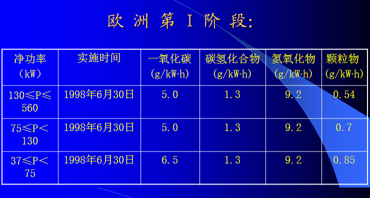 欧盟控制非道路移动机械用压燃式发动机的排放指令是 97/68/EC(1998年3月19日开始实施)。从1998年6月30日开始,对37 kW≤P<560kW 的非道路移动机械用压燃式发动机分功率段实施第I阶段的排放限值;从1999年12月31日开始,对18 kW≤P<560kW 的非道路移动机械用压燃式发动机分阶段、分功率段实施第II阶段的排放限值。对于变速发动机,采用ISO8178-4规定的C1测试循环(八工况循环)进行测试;对于恒速发动机,采用ISO8178-4规定的D2循环(五工况循环)进行测试。