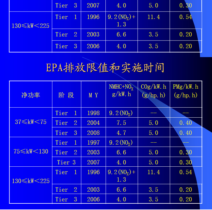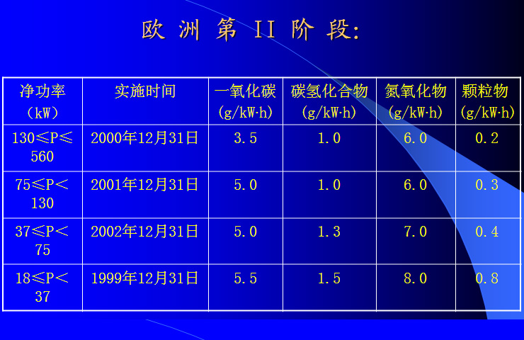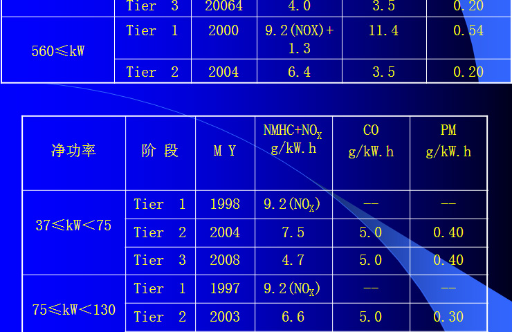 欧洲、美国和日本的非道路用发动机的排放限值分别依功率来划分档次,不同功率档次的发动机的排放限值、实施日期不同。大功率的发动机的排放限值较严,而小功率的发动机的排放限值较松,这与发动机的实际排放状况和技术水平一致,比较科学合理。而JB8891是参照欧盟早期的车用柴油机排放控制标准制订的,没有对功率档次进行必要的划分,限值都一样,不很科学。