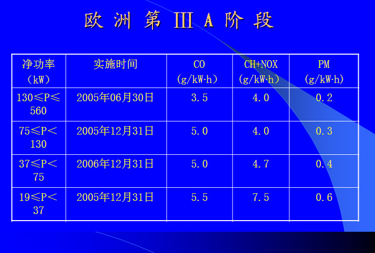 b、制订了Ⅲ A、 Ⅲ B和IV阶段的排放限值,对“内河船机”、“铁路机车”、“轮轨”和“恒速发动机”分别进行控制。