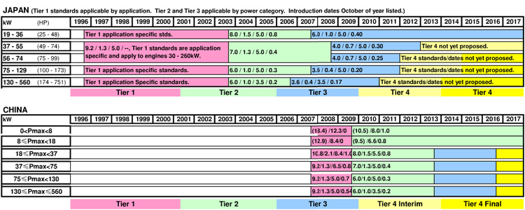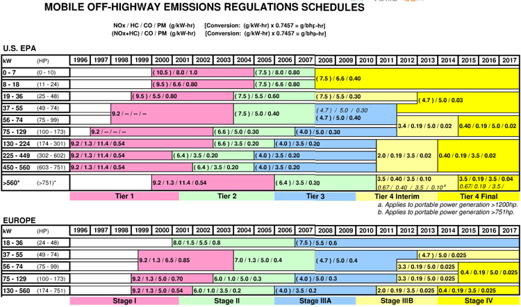 8. For U.S. Tier 4, "Split-family" standards are shown for 56 - 560kW. Optional "Phase-in" standards for NOx are permitted by EPA.