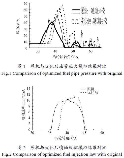 通过以上措施,以P523 型喷油器为例,从优化前后油管压力及喷油规律对比可见(如图1、2),优化方案不仅提高了喷油压力(增大34.6%)及供油速率(提高20%),而且缩短了喷油持续期(缩短22%),有利于改善燃油在燃烧室内的雾化混合,为提升柴油机的燃烧与