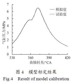 通过标定工况下的原机缸内压力模拟值与试验值对比来对模型进行标定,见图4。可以看出模拟值与试验值基本一致,缸压值误差均在3%以内,说明模型的计算精度较好,较为准确地反映了柴油机燃烧过程,可以用来进行燃烧系统参数匹配优化与设计工作[17]。