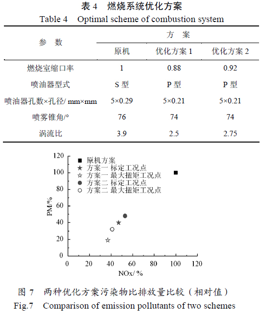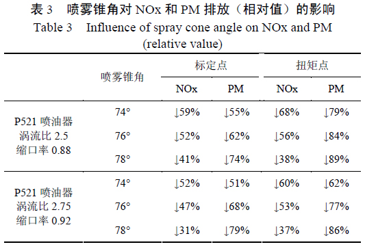 最后,研究喷雾锥角对排放性能的影响。表3 为2种优选方案其排放性能随喷雾锥角变化的关系,结果显示,随着喷锥锥角的增大,NOx 排放值在提高,PM 排放水平降低,由此,确定喷雾锥角均为74°。