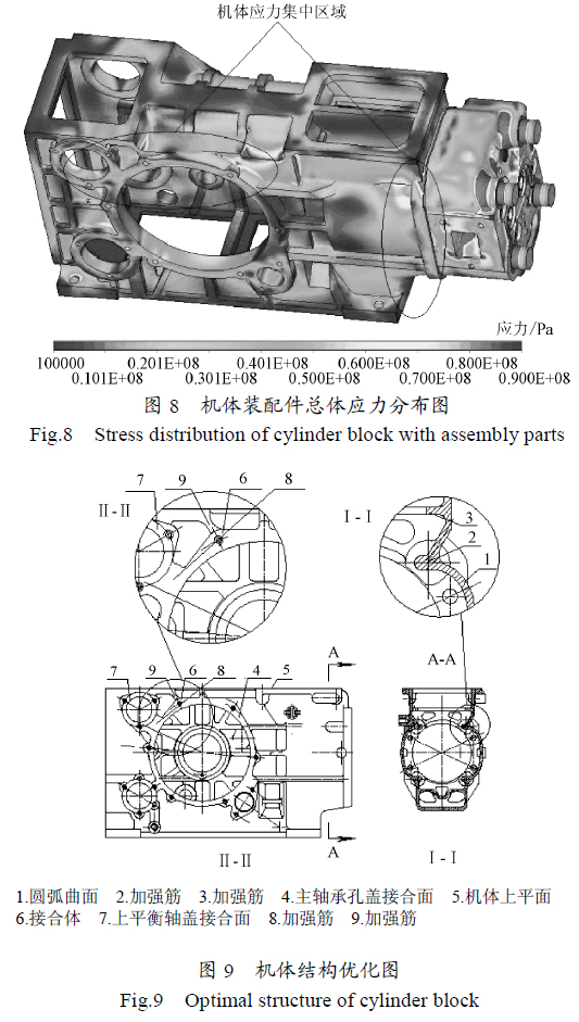 样机单缸卧式柴油机机体的设计采用直角大平面框架模式,因而重要部位如在机体头部及主轴承孔盖接合面部位因加强不到位而带来局部刚性不够的问题。利用ansys 有限元分析软件对机体进行结构强度分析,见图8,机体头部及主轴承孔附近应力较大,易发生变形甚至开裂,因此对上述部位进行加强。如图9 所示,机体头部的机体侧壁通过圆弧曲面与内螺栓孔底部加强筋连接,以减少机体连接处的应力来提高机体强度,并通过增加加强筋尺寸,提高机体头部的强度和刚度。其次针对主轴承孔孔径较大,造成机体强度较弱的特点,如图9 所示,增大承孔盖接合面外侧尺寸,而且主轴承孔盖接合面与机体上平面以与圆弧相切加高平板的接合体连接,通过增加上平衡轴盖接合面与主轴承孔盖接合面之间的加强筋的宽度,以及新增主轴承孔盖接合面与机体上平面之间的加强筋来提高主轴承孔盖接合面的强度,降低机体中部的应力集中,减小机体变形,从而直接降低机油消耗。图8