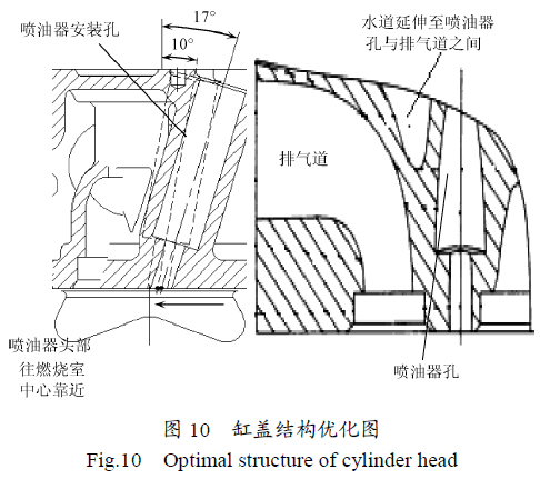 如图10 所示,将喷油器的安装倾斜角度由原机的17°减小为10°,倾斜角度越接近于垂直,各喷孔的出油量差值越小;同时改用外径较小的P 型喷油器,使喷油器位置离燃烧室中心越近,油束在周向分布的间隔更加均匀,喷雾油线包围的面积趋于相等,由此提高了燃烧室内的空气利用率,使柴油机的燃烧过程得到改善。但是,由于喷油器向燃烧室中心靠近,进、排气门与喷油器孔之间的三角地带缩小,带来相应的热负荷问题,因此需对冷却水腔进行改进。如图10 所示,将冷却水腔延伸至喷油器孔和排气道之间的缸壁处,从而保证喷油器及缸盖高温部分在工作中能得到良好的冷却。