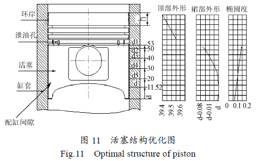 活塞形状与参数优化:如图11 所示,活塞环岸区在纵向设计成锥形,同时适当缩短火力岸的高度h(9~13 mm),加大火力岸与气缸孔的间隙,避免因活塞挤压顶岸上的积碳而擦伤气缸壁,也降低了因活塞顶边缘积碳后刮油致使机油消耗量增加的可能性。合理地设计活塞的椭圆度及裙部型线,并适当减小了配缸间隙,适应缸套内孔的微量失圆度,加宽裙部接触带,以确保活塞与缸套间的最小油膜厚度,既有利于润滑,又降低了机油耗。在活塞第三道环岸侧推力方向开泄油孔,降低了机油消耗量。